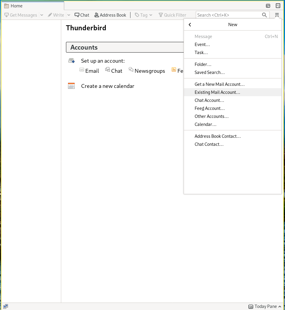 Let us add a new account, click on the main menu, then select New, and then Existing Mail Account...