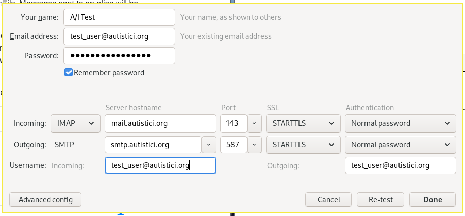| SMTP | smtp.autistici.org | 587 | STARTTLS | Normal password |