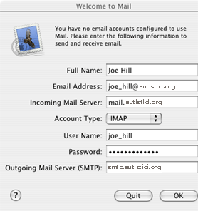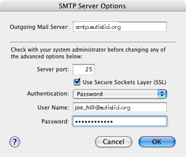 - VERY IMPORTANT! If you plan to set up secure connections, do not enter your correct password, because it will be transmitted over the internet in “clear text”. Enter an incorrect password here. You will occasionally get a dialog box requesting your password when mail attempts to check your mail. Ignore it until you finish setting up the secure connections. Just hit cancel when these messages appear.