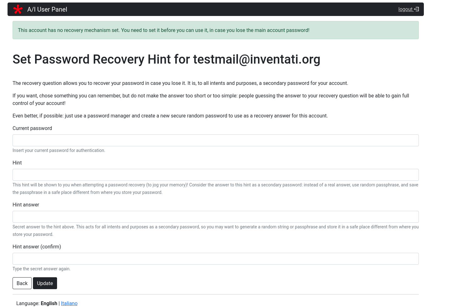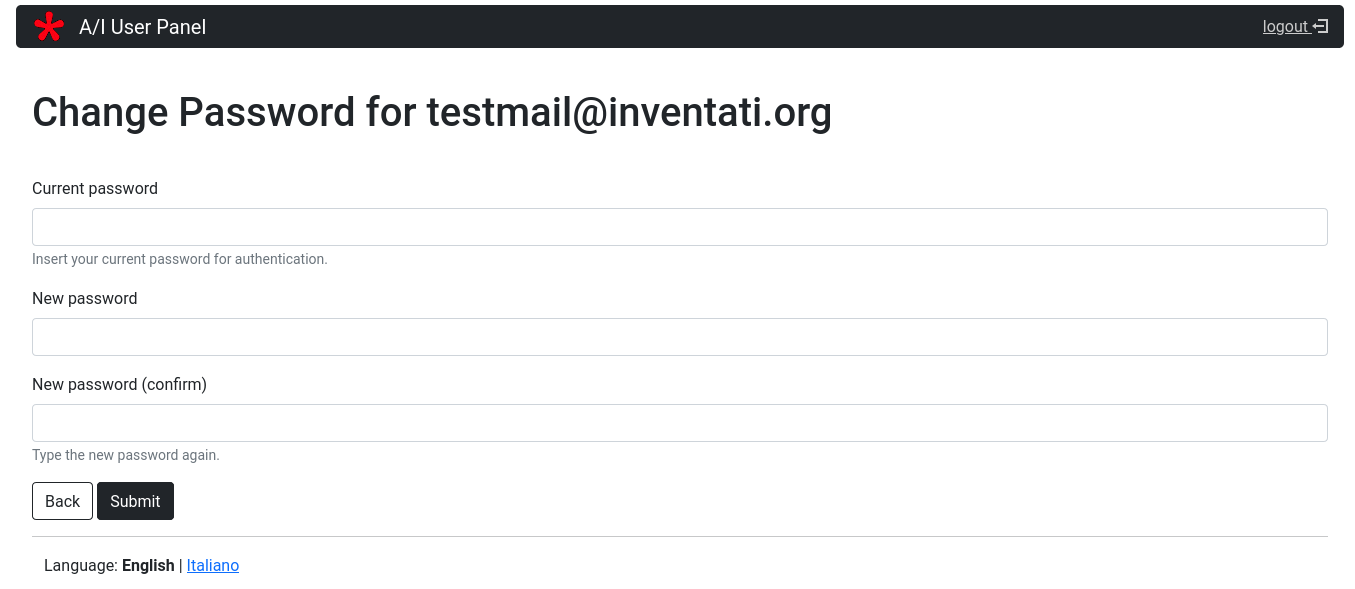 Once you click on the Change password link you will be directed to a form where you can fill in twice your new password. Once you’ll have done so and clicked on the Update button, you’ll have a new password to login into your User Panel AND to login into your mailbox.