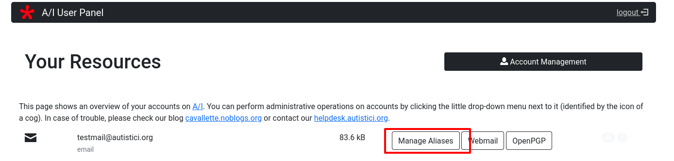 On A/I servers you can have and manage at most 5 aliases for any single account you have. If you need more, please contact us. If you want to create an alias for your mailbox, click on the link next to your mailbox account.