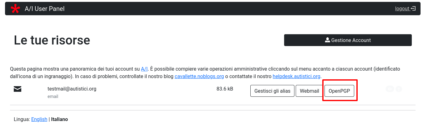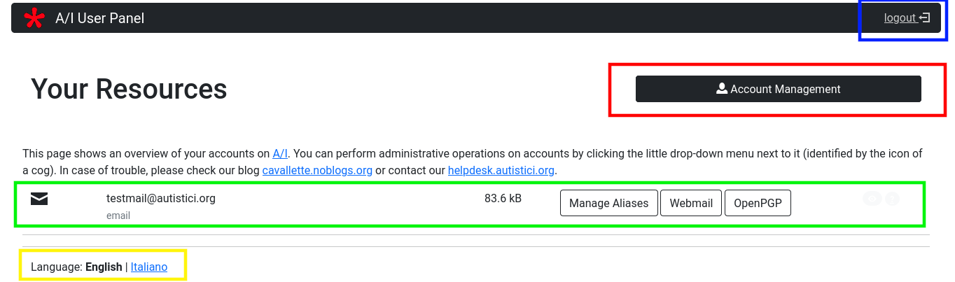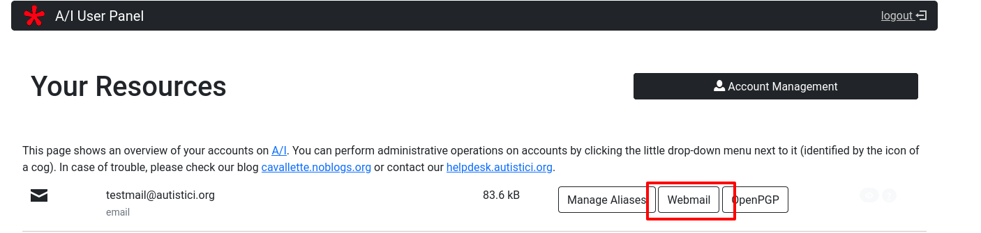 - And in the top right, squatted by a Blue box there’s a link to logout of the User Panel. If you did not move on to your mailbox, remember to click on it before leaving the panel.
