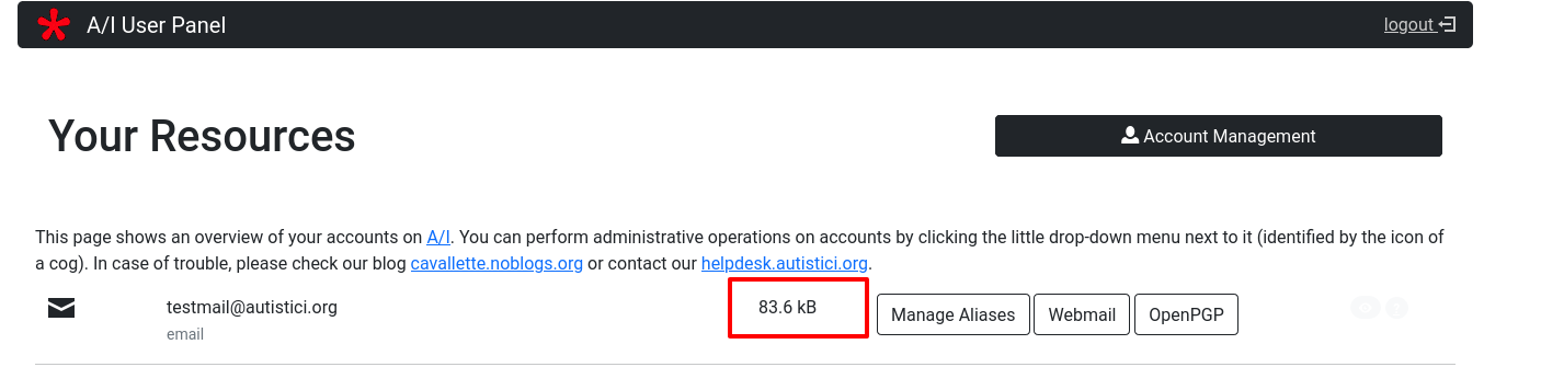 If you want to know how much space are you using up, it’s reported next to your mail address, see image below. We would like to remind you that we do not set a maximum amount of space for your mailbox, but remember that our resources are not endless and that you share our servers with thousands of other people. Be careful how much space you use up.