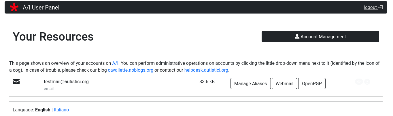 What you can see in the picture above is a very basic version of how your User Panel could look like. It’s the User Panel of someone owning a simple mailbox on our servers. No additional addresses, no website, no list, no newsletter, no nothing. More or less like the 50% of our users, so don’t feel ashamed or anything.