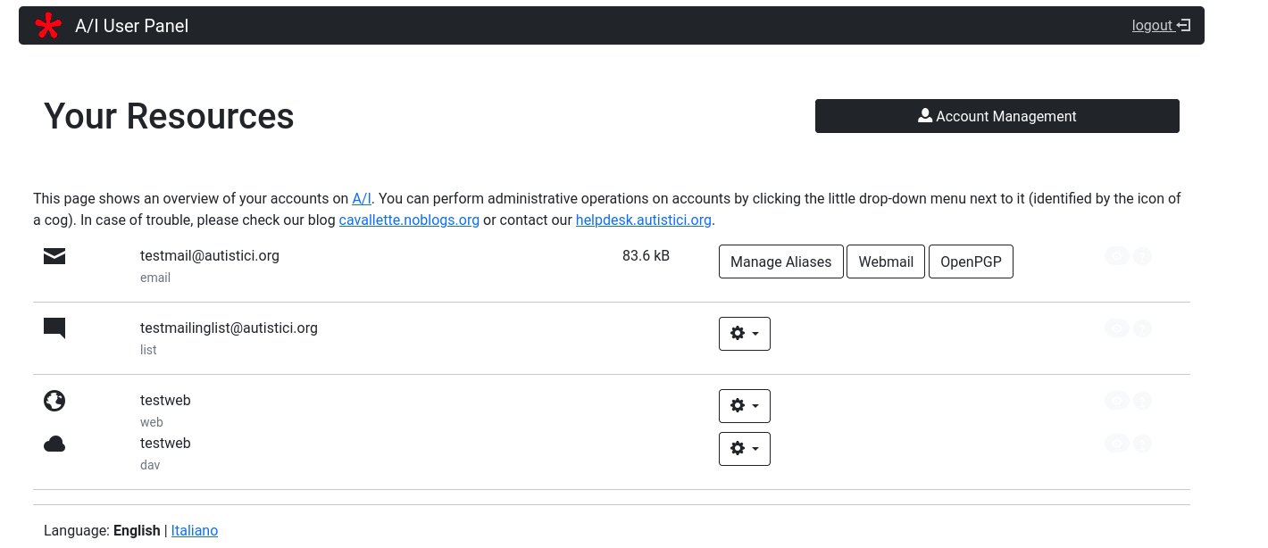 If you requested to A/I something more than a simple mailbox address then your User Panel will be somewhat more complicated. If you are managing some website on A/I servers, your account management area will be enriched by a new section.
