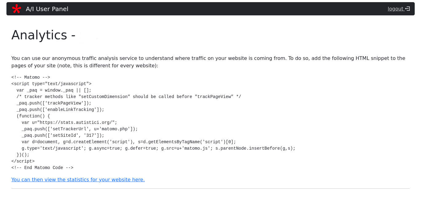 - Analytics opens a page where you can find the code you need to add to your site to use A/I web statistics tool. See A/I stats Howto for more information.