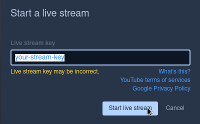 Enter your stream key. For example, if you want your stream to be available at the address “https://live.autistici.org/#myawesomebroadcast", your stream key should be “myawesomebroadcast”.